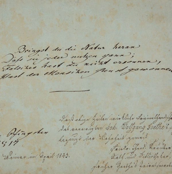 "Die übersandten Blätter sind mir von unendlichem Werth; denn da mir die sinnliche Anschauung durchaus unentbehrlich ist, so werden mir vorzügliche Menschen durch ihre Handschrift auf eine magische Weise vergegenwärtigt."
